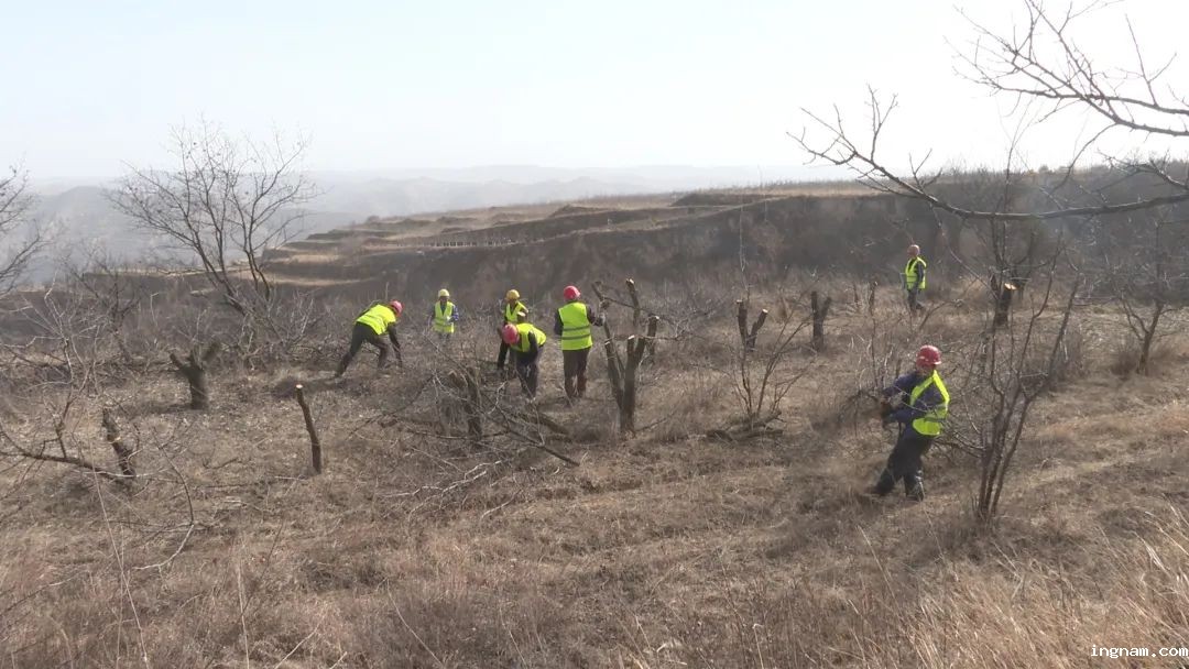 出境记者高亮:果园改造忙春耕 抢抓农时不负春,我现在所在的位置是崇信县锦屏镇文家咀村,在我的身后,工作人员正在为老旧杏树高接换优,进行新品种嫁接,使老旧果园焕发生机。