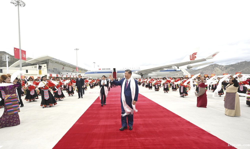 西藏自治区党委书记王君正、自治区人大常委会主任严金海、自治区人民政府主席嘎玛泽登、自治区政协党组书记刘江等在舷梯下迎候。习近平走下舷梯时,王君正敬献哈达,礼仪人员敬献切玛和青稞酒。各族群众代表身着节日盛装,挥动红旗和五彩花束,跳起欢快的民族舞蹈,欢迎总书记的到来,表达对总书记的衷心祝福。