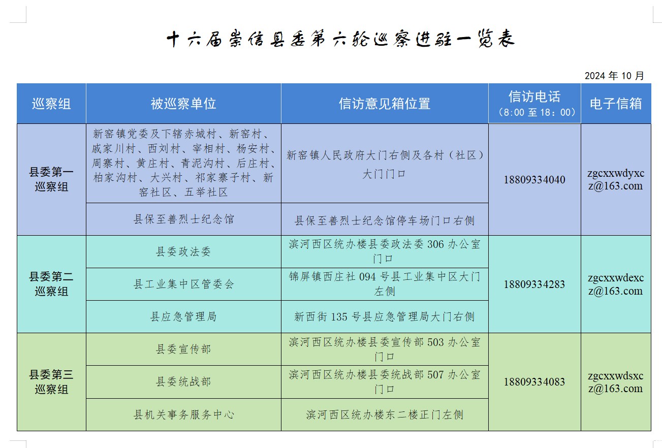根据县委统一部署,十六届县委第六轮巡察对县委宣传部、县委统战部、县委政法委、县工业集中区管委会、县保至善烈士纪念馆、县应急管理局、县机关事务服务中心、新窑镇党委及下辖村(社区)开展常规巡察。截至10月16日,县委3个巡察组完成巡察进驻工作。