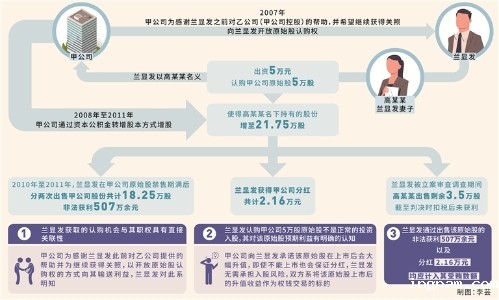 其中,2006年,甲公司控股的乙公司成立,乙公司总经理赖某请托兰显发利用职务便利在乙公司扩大农机产品市场、获取农机购置补贴等方面提供帮助。2007年,甲公司筹备上市,甲公司为感谢兰显发此前的职务行为并希望继续获得关照,向兰显发开放原始股认购权,并承诺公司上市后该原始股会有大幅增值,即使没有上市也会保证分红,兰显发表示同意。2008年2月,兰显发以其妻高某某名义出资5万元认购甲公司原始股5万股。2009年10月,甲公司上市。2008年至2011年,甲公司通过资本公积金转增股本方式增股,使得高某某名下持有的股份增至21.75万股。2010年11月至2011年5月,兰显发在原始股禁售期满后,分两次出售股份共计18.25万股,扣除股本金、手续费、税费后非法获利507万余元。兰显发被立案审查调查期间,高某某出售剩余3.5万股,截至判决时扣税后暂未获利。此外,兰显发所持股份获得甲公司分红共计2.16万元。