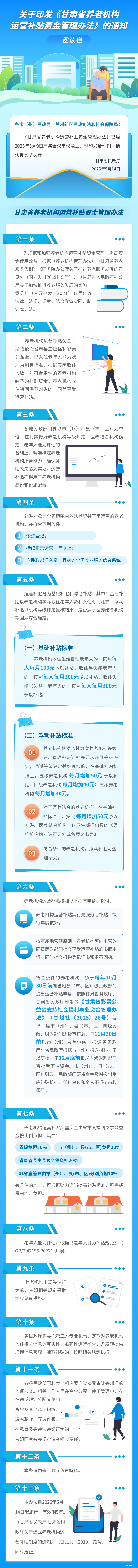 一图读懂丨《甘肃省养老机构运营补贴资金管理办法》 发文日期:2025-06-12 15:00 来源:甘肃省民政厅网站 作者:甘肃省民政厅网站 编辑:梁丽菲 相关文件链接:关于印发《甘肃省养老机构运营补贴资金管理办法》的通知 扫一扫在手机打开当前页 上一篇: 一图读懂-甘肃省建立碳足迹管理体系工作方案 下一篇: 《关于印发甘肃省“儿科和精神卫生服务年”行动实施方案(2025-2027年)的通知》政策解读
